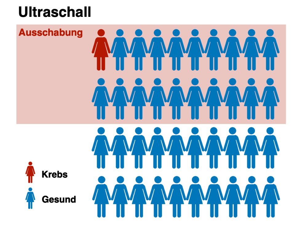 Von 40 Frauen, die während oder nach dem Wechsel unter abnorale Blutungen leiden hat in etwa eine Frau Gebährmutterkörperkrebs. Dennoch wird der Ultraschall bei 20 dieser Frauen (rötlich unterlegt) Alarm geben und die Frauen müssen sich einer Ausschabung unterziehen. Von diesen 20 Frauen haben 19 Frauen keinen Krebs.