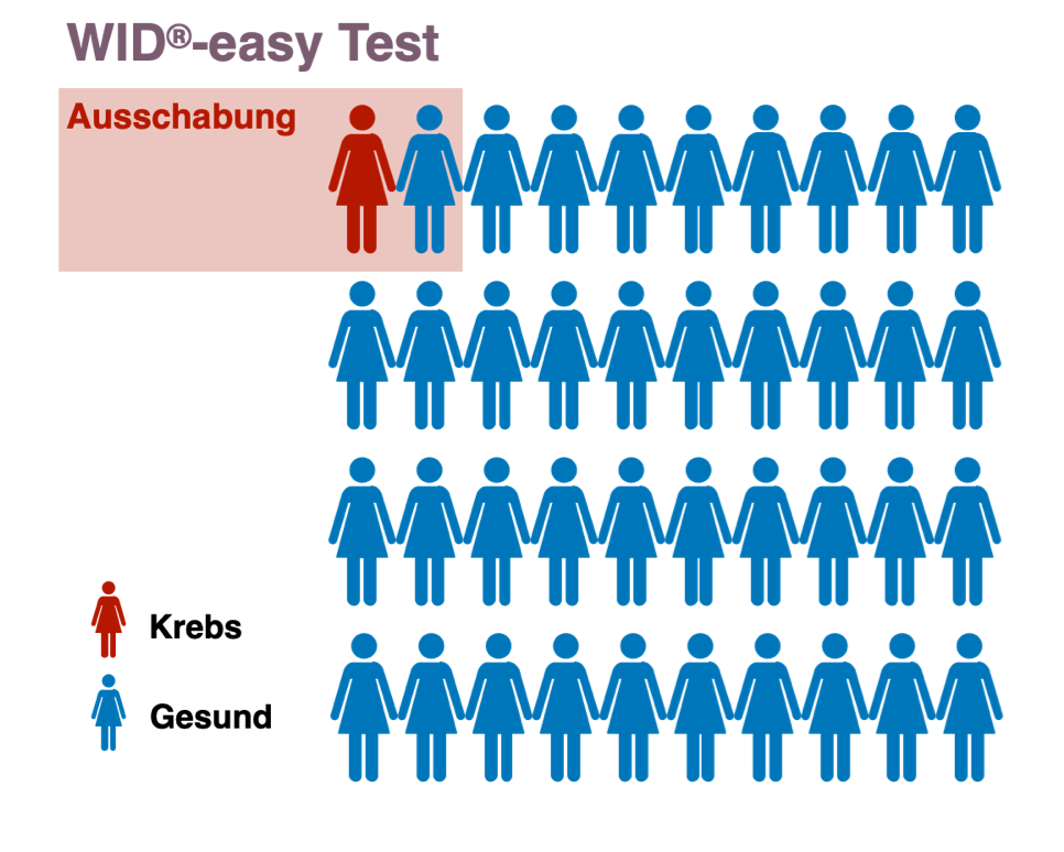 In der gleichen Situation wird der WID®-easy Test lediglich bei zwei Frauen ein positives Ergebnis haben, so dass sich nur zwei Frauen einer Ausschabung unterziehen müssen (rötlich unterlegt). Von diesen zwei Frauen hat nur eine Frau keinen Krebs.